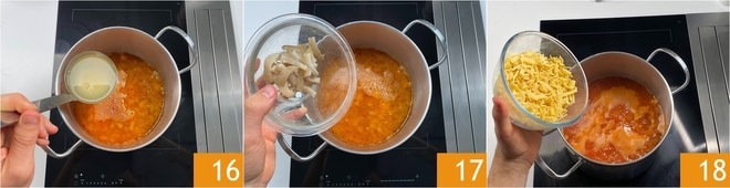 Adicione também 2-3 conchas de água de cozimento dos feijões 16. Assim que ferver, adicione a pele de porco 17, misture e acrescente a pasta 18, depois salgue.