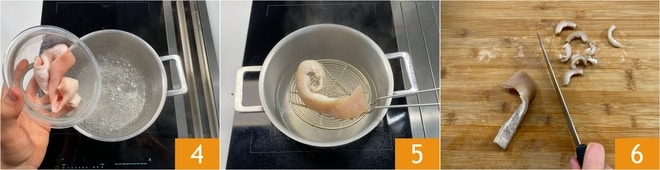 Quando os feijões estiverem quase cozidos, cuide da pele de porco. Elimine eventuais cerdas raspando com a lâmina de uma faca e mergulhe-a em água fervente 4. Cozinhe por 20 minutos, até que fique macia. Escorra 5 e deixe esfriar, depois corte em tiras de 1 cm 6.
