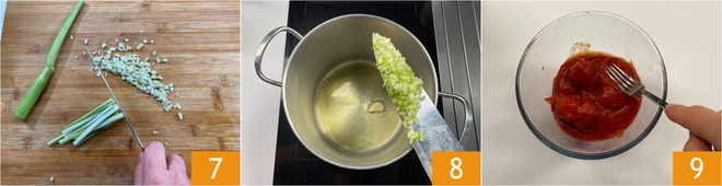 Pique finamente o aipo 7, depois deixe refogar em uma panela em fogo baixo com um fio de azeite e os dentes de alho 8. Enquanto isso, amasse os tomates pelados com um garfo 9.