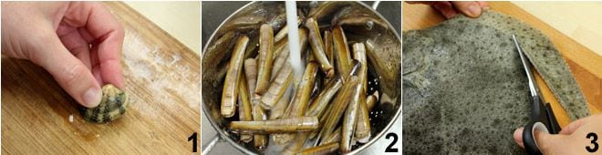Para preparar o macarrão e peixe em molho, comece limpando todo o peixe: lave muito bem os mexilhões em água fria, descartando os quebrados ou abertos, e remova o bisso (barba) que sai das conchas raspando-as com uma faca ou com uma esponja de aço nova (Como limpar e abrir mexilhões). Para as amêijoas, aqui vai uma dica para eliminar as cheias de areia: arme-se de paciência e pegue uma de cada vez, bata a amêijoa com a parte do corte sobre uma tábua de madeira 1 e verifique se sai algo preto. Se isso acontecer, descarte a amêijoa porque estará cheia de areia escura. Enxágue as tamarutacas e as navalhas em água fria 2.