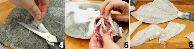 e as duas laterais 4; depois, com a ponta de uma faca, faça uma pequena incisão no estômago para retirar as entranhas 5. Retire a pele com a lâmina afiada de uma faca, a seguir retire as espinhas e obtenha 4 filés 6.