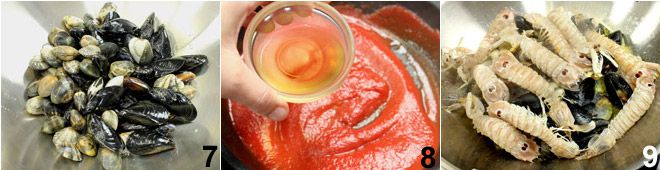 Em uma panela grande, prepare um refogado com um dente de alho amassado e azeite de oliva extravirgem, coloque os mexilhões e as amêijoas 7, cubra com uma tampa e deixe abrir. Enquanto isso, em uma panela pequena, dissolva o extrato de tomate com um pouco de água e adicione o vinagre de vinho branco 8. Adicione aos mexilhões e amêijoas já abertos também as tamarutacas inteiras 9,