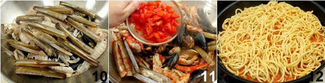os filés de linguado e as navalhas 10, tempere com sal, pimenta e adicione o extrato de tomate. Cubra a panela e cozinhe por cerca de 5/7 minutos. Adicione então os tomates cereja picados 11 e a salsinha picada. Escorra o macarrão que você cozinhou em água fervente salgada (nós usamos macarrão fresco), adicione o molho de cozimento do peixe, duas colheres de sopa de azeite de oliva extravirgem e misture bem o macarrão 12. Sirva o macarrão e peixe em molho colocando em cada prato uma fatia de filé de linguado, depois o macarrão e, por último, mexilhões, amêijoas, tamarutacas e navalhas.