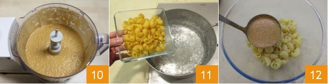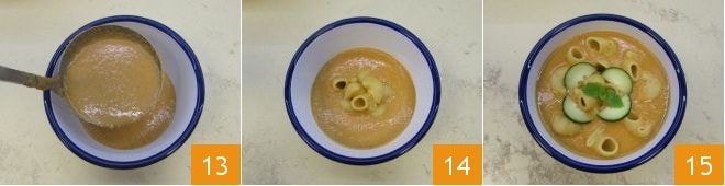 Bata novamente por alguns segundos até obter uma mistura lisa e homogênea 10. Então, deixe o gazpacho repousar por algumas horas. Entrementes, cozinhe as pipe rigate em uma panela com água fervente salgada a gosto 11. Em seguida, escorra al dente e esfrie o macarrão sob água corrente fria. Depois, escorra bem e transfira para uma tigela grande, despeje parte do gazpacho para temperar o macarrão 12.