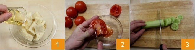 Para preparar o macarrão frio com gazpacho, comece por este último: retire do pão velho o miolo para colocar em uma tigela e umedecer com água e vinagre de vinho branco 1; deixe absorver os líquidos, depois escorra com uma peneira e reserve. Em seguida, passe a limpar e cortar os legumes: lave e corte ao meio os tomates rama, coloque-os em uma tigelinha para eliminar as sementes internas 2; corte as pontas e descasque o pepino e corte-o em rodelas 3.