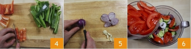 Continue com os pimentões verdes e vermelhos: lave-os e divida-os ao meio, depois remova o talo e o filamento interno com as sementes, em seguida, corte as fatias em tiras 4. Finalmente, descasque a cebola roxa e o dente de alho e corte-os grosseiramente 5. Coloque os legumes cortados em pedaços em um mixer 6, adicione o azeite de oliva extra virgem em fio, ajustando também o sal e a pimenta a gosto