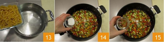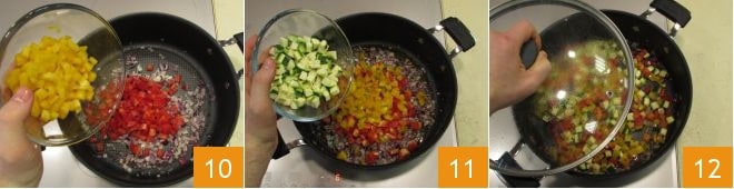 Adicione os pimentões 10 e abobrinhas 11 e salteie por alguns minutos. Tempere com sal, abaixe o fogo e tampe a panela por 5 minutos 12.
