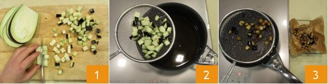 Para preparar o macarrão frio com caponata de legumes, comece pelas berinjelas. Lave-as, seque-as e corte-as em cubos de 1 cm 1. Agora frite as berinjelas: aqueça o óleo de sementes em uma panela de borda alta e mergulhe poucos pedaços por vez 2, assim a cocção será uniforme e a temperatura do óleo não abaixará. Quando os cubos estiverem dourados, escorra-os em papel absorvente 3 e tempere com sal.