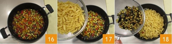 misture e cozinhe por mais alguns minutos, depois desligue o fogo 16. Por fim, adicione o macarrão já cozido 17, as berinjelas fritas 18