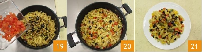 e os tomates cortados em cubos 19 e misture tudo. Deixe esfriar 20 e antes de servir seu macarrão frio com caponata de legumes 21.
