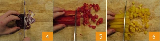 Passe para a cebola, descasque-a e pique com uma faca 4. Depois cuide dos outros legumes, limpe-os e corte-os também em cubos de 1 cm. Comece pelos pimentões vermelhos e amarelos (5-6)