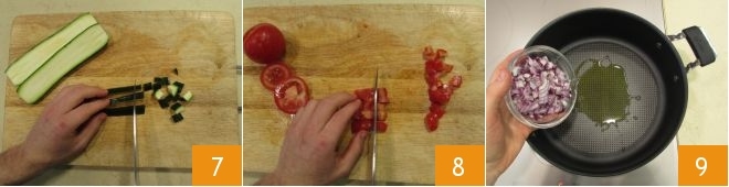 E prossiga do mesmo modo com as abobrinhas 7 e os tomates 8. Enquanto isso, coloque no fogo uma panela cheia de água salgada e leve-a à fervura, será usada para cozinhar o macarrão. Em uma frigideira, despeje um pouco de azeite de oliva, em seguida, adicione a cebola 9 e deixe dourar por 2 minutos em fogo médio.