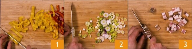 Para preparar o macarrão com pimentões e bacon, primeiro prepare os ingredientes: limpe os pimentões removendo a parte superior, os filamentos e as sementes internas, depois corte-os em tiras não muito finas 1. Limpe e fatie também os cebolinhos, incluindo a parte verde 2. Por fim, corte o bacon em cubos 3.