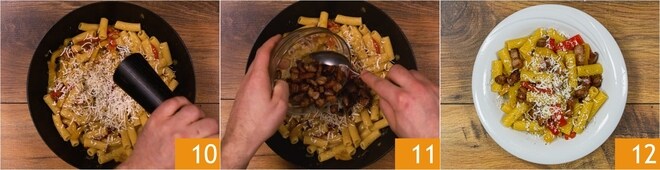 Retire a frigideira do fogo, adicione a ricota seca ralada e uma pitada de pimenta 10, depois adicione o bacon reservado 11. Misture bem e sirva seu macarrão com pimentões e bacon, adicionando mais ricota seca e pimenta a gosto 12!