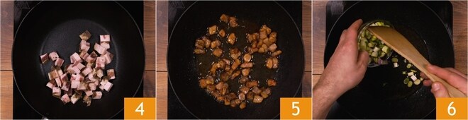 Aqueça uma frigideira grande e doure o bacon em fogo moderado 4. Quando estiver crocante e dourado 5, remova o bacon e deixe a gordura na frigideira. Adicione os cebolinhos 6 e doure-os por alguns minutos, ainda em fogo médio.