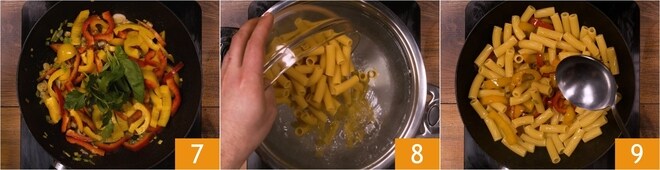 Agora, adicione também os pimentões junto com as folhas de salsinha e manjericão 7. Adicione sal e cozinhe por 10-15 minutos, adicionando um pouco de água se necessário; eles devem ficar macios. Enquanto isso, ferva uma panela de água salgada e cozinhe o macarrão até ficar bem al dente 8. Escorra o macarrão na frigideira com o molho e adicione uma concha da água do cozimento 9, depois salteie tudo por um minuto.