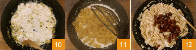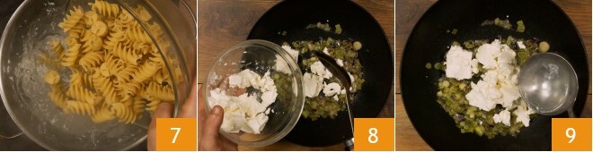 Cozinhe agora a massa na água fervente salgada e cozinhe-a al dente 7. Quando a cebolinha estiver murcha, desligue o fogo e adicione a robiola 8 junto com uma concha de água de cozimento da massa 9.