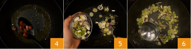 Doure o speck por cerca de 3-4 minutos em fogo médio, mexendo frequentemente. Quando estiver dourado, retire-o da frigideira 4. Na mesma base de cozimento, adicione a cebolinha 5 e deixe refogar em fogo baixo por cerca de 5 minutos, adicionando um pouco de água quente 6.
