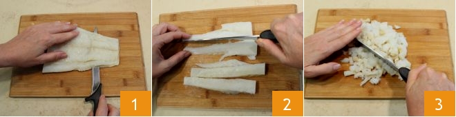 Para preparar os bolinhos de bacalhau, comece limpando o peixe. Assegure-se de que seu bacalhau já esteja dessalgado, caso contrário, Como dessalgar o bacalhau. Neste ponto, retire a pele do filé, usando uma faca bem afiada e deslizando-a paralelamente às carnes 1. Corte o pedaço de peixe primeiro em tiras 2 e depois em cubos, picando-o com a faca 3.