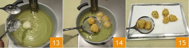 Adicione a pimenta-do-reino moída 10 e, se necessário, uma pitada de sal. Cubra com filme plástico e deixe a massa descansar por cerca de 20 minutos em um lugar fresco. Após esse tempo, aqueça o óleo para fritar em uma panela grande até atingir a temperatura de 175°, para medir a temperatura correta você pode usar um termômetro culinário. Quando o óleo estiver quente, com a ajuda de 2 colheres que você pode mergulhar no óleo de vez em quando, pegue uma porção de massa 12