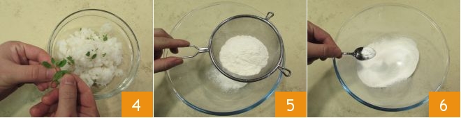 Depois de picar grosseiramente, transfira para uma tigela pequena e adicione as folhas de manjerona 4. Em outra tigela, peneire as duas farinhas juntas 5 e adicione o fermento em pó 6.
