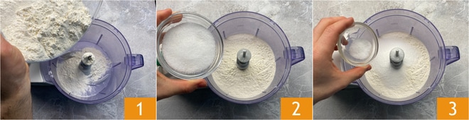Para preparar a pastiera salgada, comece colocando no processador a farinha 1, o açúcar 2, o sal 3.