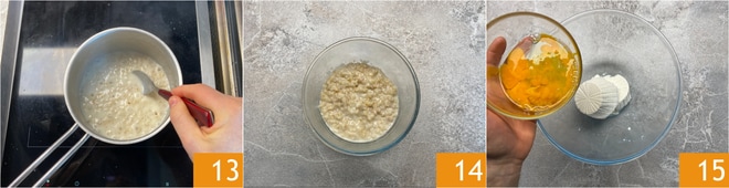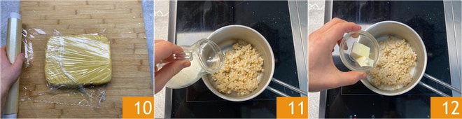Envolva em filme plástico e deixe descansar na geladeira por 1 hora 10. Enquanto isso, coloque o trigo em uma panela com leite 11 e manteiga 12.