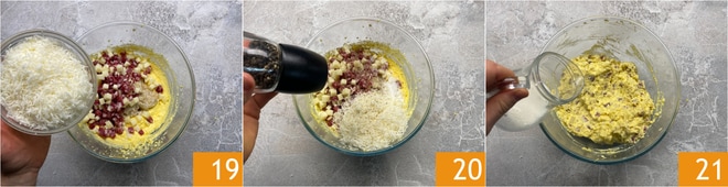 Adicione também o pecorino ralado 19, sal e pimenta 20 e misture bem. Se perceber que a mistura está muito seca, adicione um pouquinho de leite 21 para ajustar a consistência.