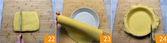Retome a massa e trabalhe-a alguns minutos com o rolo para torná-la novamente plástica. Separe um pedaço suficientemente grande para ser aberto a uma espessura de 7-8 mm 22. Em seguida, forre uma forma cônica, untada e enfarinhada, que mede na superfície 27 cm e na base 22 cm. Desenrole com a ajuda do rolo dentro dela 23 e remova os excessos com uma faquinha 24.