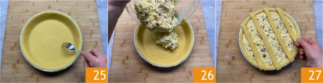 Fure com um garfo a base e as laterais 25 e despeje o recheio no meio, nivelando cuidadosamente 26. Finalmente, amasse os pedaços restantes da massa podre salgada com o pedaço reservado e abra novamente para obter 7 tiras. Disponha as primeiras 4 27