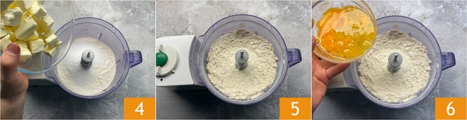 Adicione a manteiga fria em pedaços 4. Acione as lâminas até obter uma mistura arenosa 5. Adicione os ovos 6.