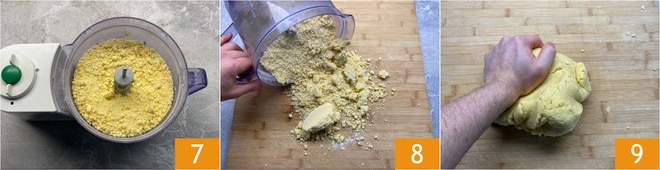 Trabalhe mais um pouco 7. Finalmente, transfira para a bancada 8 e amasse à mão até obter uma massa 9.
