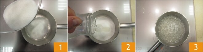 Para preparar a pâte à bombe, despeje em uma panela o açúcar 1 e a água 2. Comece a cozinhar a calda em fogo baixo e, de vez em quando, verifique a temperatura usando um termômetro de cozinha; ela deve atingir 121ºC. Quando chegar a 115ºC 3, despeje as gemas em uma tigela.