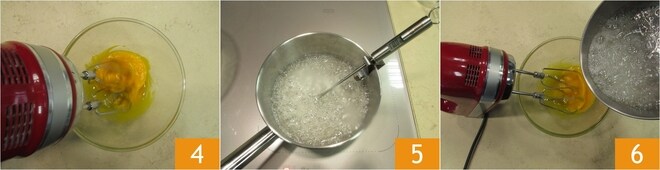 Comece a bater as gemas com uma batedeira elétrica 4 e assim que a calda atingir 121ºC 5, despeje lentamente dentro das gemas, mantendo as pás em movimento, em baixa velocidade 6.