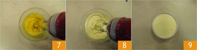 Continue batendo, aumentando ligeiramente a velocidade das pás 7, até obter uma mistura clara, volumosa e espumosa 8. Trabalhe ainda até que volte à temperatura ambiente. A pâte à bombe está pronta para ser utilizada em várias receitas 9.