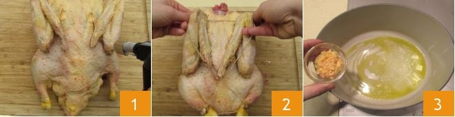 Para preparar o pato ao molho de laranja, providencie um pato já limpo das vísceras, da gordura e de eventuais penugens, caso contrário, você terá que limpá-lo cuidadosamente antes de usá-lo na receita. Remova as penugens eventualmente ainda presentes queimando-as com um maçarico 1, depois enxágue bem sob água corrente por dentro e por fora e seque-o perfeitamente com um pano de cozinha. Passe a amarrá-lo: com a ajuda de um barbante elástico para alimentos (encontrado em qualquer loja de utensílios domésticos) amarre as asas passando pelos ombros e passando pela barriga amarre também as pernas 2. Isso servirá para manter bem a forma do pato inteiro durante o cozimento. Em uma panela grande, aqueça o óleo, depois adicione a gordura excessiva do pato reservada 3, deixe refogar por alguns minutos.