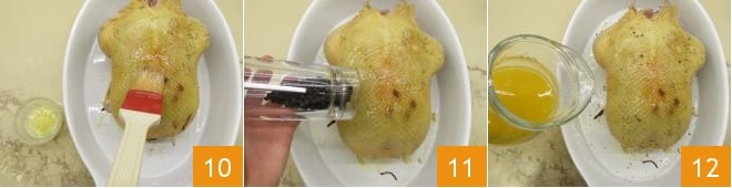 Pincele o pato com os 40 g de manteiga derretida 10, salgue, apimente 11 e despeje no fundo da assadeira cerca de 50 g de suco de laranja 12