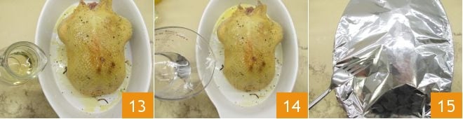 o vinho branco 13 e 20 g de água 14. Antes de transferi-lo para o forno, cubra o pato com uma folha de alumínio que será perfurada com os dentes do garfo 15 para facilitar o cozimento e não queimar a superfície do seu pato. Transfira para o forno estático pré-aquecido a 200° e cozinhe o pato com a ajuda de uma sonda até atingir 70° no centro: levará cerca de 1 hora e 10 minutos.