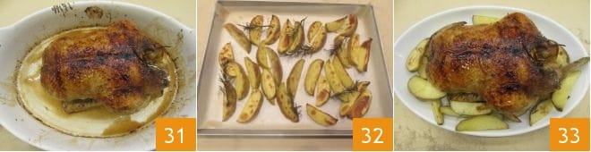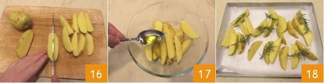 Prepare também as batatas que irão ao forno separadamente, mas na mesma temperatura do pato: lave-as cuidadosamente e limpe-as com um pano de cozinha, depois corte-as em pedaços possivelmente iguais, deixando a casca 16; tempere-as em uma tigela com óleo 17, sal e pimenta. Em seguida, transfira-as para uma assadeira forrada com papel manteiga e aromatize com alecrim 18. Coloque no forno junto com o pato (pode posicioná-las no nível inferior do forno); elas deverão assar na mesma temperatura por cerca de 30 minutos.