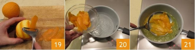 Enquanto isso, dedique-se ao molho: descasque a laranja com um descascador 19, esprema o suco e coe: serão necessários 150 g. Em seguida, escalde rapidamente as cascas de laranja em água fervente 20, depois escorra-as 21