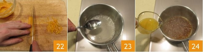 e corte-as em tiras muito finas 22. Dedique-se ao molho derretendo o açúcar junto com a água em fogo baixíssimo 23: você deve atingir a temperatura de 166° medindo com um termômetro de cozinha e a esse ponto despeje o suco de laranja coado 24;