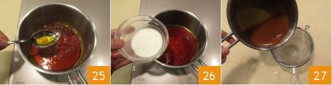 misture com um batedor para emulsionar tudo e adicione algumas colheres do fundo de cozimento do pato 25 e o amido de milho diluído em 20 g de água 26. Continue trabalhando o molho com o batedor até que ele engrosse, então desligue e coe o molho através de uma peneira 27,