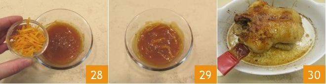 depois adicione as cascas de laranja finamente fatiadas (28-29) e reserve. Após atingir a temperatura interna, retire o pato do forno, remova o papel alumínio, pincele-o com o molho de laranja 30 e coloque-o no grill por cerca de 5/10 minutos (o tempo varia de acordo com a potência do forno) para deixá-lo bem dourado.
