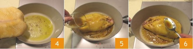 Coloque o pato e doure-o em fogo médio de um lado 4 e do outro; em seguida, flambe com o Grand Marnier 5 e regue com o fundo de cozimento 6.