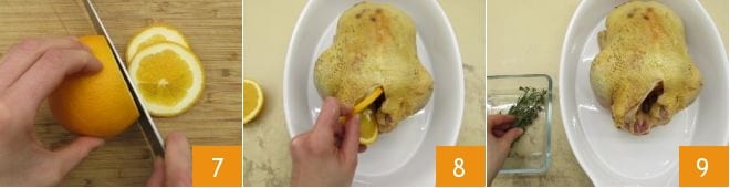 Enquanto isso, corte as laranjas em fatias 7 e quando o pato estiver bem dourado, transfira-o para uma assadeira com bordas altas e recheie o interior com três fatias de laranja 8, o tomilho e o alecrim 9.