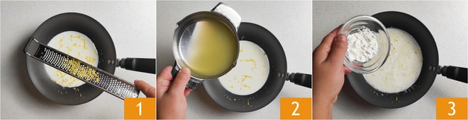 Para preparar os pedacinhos de vitela ao limão, a primeira coisa que você deve fazer é dedicar-se ao molho de limão. Em uma panela, despeje o leite junto com a casca ralada 1 e o suco de um limão 2. Adicione o amido de batata 3.