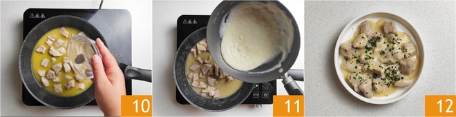 Tempere com pimenta 10, e cozinhe com a tampa em fogo baixo por 8-10 minutos. Finalmente, adicione o molho de limão 11 e cozinhe por mais alguns minutos. Mexa continuamente para evitar que o creme grude no fundo; você deve obter uma consistência espessa e aveludada. Os pedacinhos de vitela ao limão estão prontos, sirva com salsa fresca picada 12!