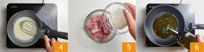 Leve ao fogo, em fogo moderado, até quase ferver. Mexa para não formar grumos 4. Desligue o fogo e mexa de vez em quando para evitar a formação de uma película na superfície. Enquanto isso, coloque os pedacinhos de vitela em uma tigela, adicione a farinha 5 e misture. Assegure-se de que toda a carne esteja coberta pela farinha, depois elimine o excesso. Em uma panela, aqueça o óleo 6.