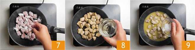 Adicione os pedacinhos de vitela 7 e doure bem. Despeje o vinho branco 8 e deixe evaporar toda a parte alcoólica, em fogo alto. Ajuste o sal 9.
