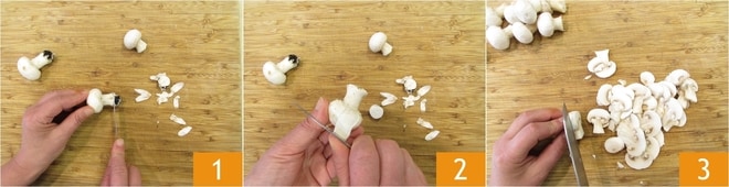 Para preparar o peito de frango ao leite e cogumelos, o primeiro passo é limpar os cogumelos: corte a parte final com terra 1 e descasque-os 2. Agora corte-os em fatias 3.